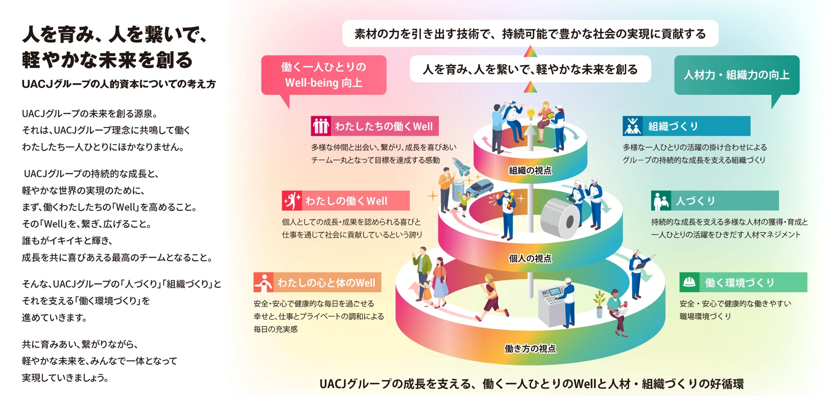 新たに策定した当社グループの人的資本についての考え方「UACJピープルステートメント」と、人材戦略を体系化した「人的資本経営の全体像」では、従来の人材戦略の視点に加えて、当社グループで働く一人ひとりのWell-beingを重視しています。人材戦略の3本の柱である「組織づくり」、「人づくり」、「働く環境づくり」の施策のなかで、従業員の「Well」とは何か、その「Well」の向上に繋がる施策は何かを整理することで、働く一人ひとりの「Well」と人材力・組織力の向上の好循環を実現していく、その活動全体を当社グループでは人的資本経営と捉えています。この考え方に基づいた人的資本経営を推進することが、当社グループの企業理念の実現には不可欠と考えています。