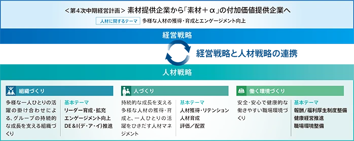 当社グループは、2024年4月よりスタートした第4次中期経営計画において、素材提供企業から「素材+α」の付加価値提供企業への変革を目指しています。新たな価値創出と安定した事業運営を支える強固な人的基盤の構築のためには、多様な人材の獲得・育成により「人材力の向上」を図るとともに、従業員エンゲージメントを高め、「組織力の向上」を実現していくことが必要です。